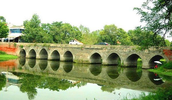 老城九孔橋:自明弘治十年(公元1497年)到建國后的1950年10月老城鎮(zhèn)一直是沈丘縣治所所在地,城南緊靠東西流向的泉河,當(dāng)時河寬水深,各種貨物可上通漯河,下達(dá)臨泉、潁州(現(xiàn)阜陽市),經(jīng)潁上至正陽入淮河,當(dāng)時是一條繁盛的“黃金水道”。但城南無橋,南北兩岸大量人員來往,貨物運(yùn)送,全靠船渡,因水大、人多、貨物超載或遇急風(fēng)惡浪,每年都有事故發(fā)生。1973年、1981年沈丘縣人民政府兩次撥款4.1萬元,維修九孔橋。因九孔橋是周口至臨泉的主要交通干道,經(jīng)常有幾十噸的大貨車在橋上行駛,常年承受著交通重載,所以到1998年南橋頭西側(cè)倒塌了十幾米,致使車輛無法行走。1999年,沈丘縣人大代表、老城東升布鞋廠廠長郭傳興個人出資5萬元,南關(guān)行政村支部書記張連營負(fù)責(zé)施工補(bǔ)修,把橋加長4米,全橋長達(dá)99米,19天后竣工,F(xiàn)橋體基本完好,車輛行人稱便。