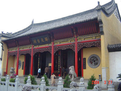 中院的主體建筑是大雄寶殿。該殿初建于清順治十八年(1661年),后經(jīng)多次維修。現(xiàn)大雄寶殿是清光緒三十四年(1908年)重修,經(jīng)過近年來的維修,氣勢宏偉。大殿正中供奉著釋迦牟尼坐像,兩側(cè)為其弟子阿難和迦葉,均為托沙雕塑。釋迦“偏袒右肩,結(jié)跏趺坐”,十分莊嚴(yán)靜穆,威儀儼然。佛像后的背光是用樟木雕刻而成的“五龍捧圣”的圖案。佛像前還有韋馱、彌勒、地藏像,佛像后是一組海島觀音像,只見海島觀音赤足站在鰲頭上,左右侍立著龍女和童子,背后是一面高達(dá)八尺的泥塑懸崖峭壁,足下碧波萬頃,怒濤洶涌。整個塑像向前傾覆。人們仰視上去,只見觀音衣袖似在飄動,正在洶涌的波濤上迎面向你浮來,增加了宗教藝術(shù)的感染力。