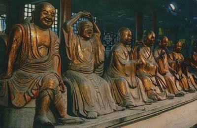 走進(jìn)羅漢堂,無不被它們的生動形象所感染。只見有的盤腿端坐,有的臥石看天,有的研讀佛經(jīng),有的驅(qū)邪除惡。表情上,有的勇武,有的溫良,有的天真憨厚,有的飽經(jīng)滄桑,個個維妙維肖,活靈活現(xiàn)。如第463尊羅漢是颯陀怒尊者,四周有6個童子,為羅漢挖耳、掩嘴、遮眼等,稱“六賊戲彌勒”。六賊即眼、耳、鼻、舌、身、意。它告誡佛門弟子,不要為凡情所染。塑像中把孩子的天真爛漫,嬌稚頑皮和羅漢的慈祥憨厚的神態(tài)刻化得淋漓盡致,讓人們從心底發(fā)出贊嘆的笑聲。