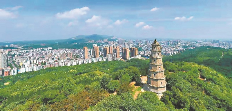 東寶塔是荊門今存的唯一一處具有千年歷史的地面文物,建于隋開皇十三年(公元593年)。寶塔通高33.3米,底部周長30.6米,七層四面八角,隔面設(shè)窗,攢尖式塔頂。塔基座周長31.2米,高0.76米。基座之上都有石須彌座,須彌座八角各雕一尊托塔金剛。底層門楣有石刻“長林頭角”四字,自底層有螺旋狀青石階梯上塔頂(海拔260米)。