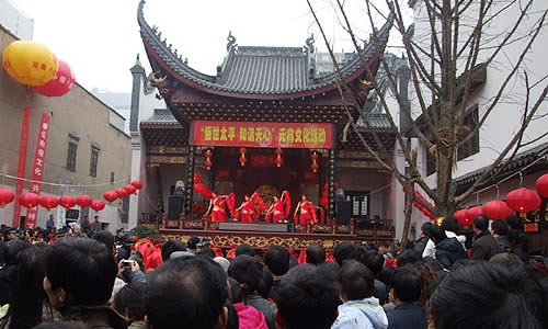 在南岳古鎮(zhèn)一帶,人們別出心裁在水上放燈迎春或送春。燈系彩紙精制成荷花狀,經(jīng)熟桐油浸透后再以松香涂抹,使之不滲水,花芯灌少量茶油,再插燈芯,點燃后放入古鎮(zhèn)內(nèi)外諸溪流中,任其飄流,小溪便宛如閃光的“燈龍”。觀燈者成千上萬,川流不息,場面頗為壯觀。