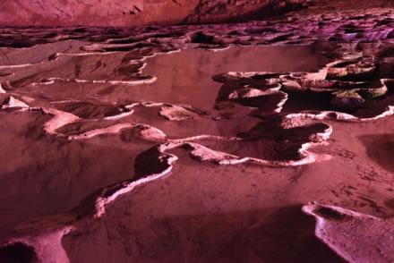 千丘田科學(xué)名稱(chēng)為“流石壩”,也叫“酸田”, 它是水平流動(dòng)的水在洞底流動(dòng)過(guò)程中形成的碳酸鈣沉積。黃龍洞內(nèi)大大小小的千丘田不計(jì)其數(shù),縱橫阡陌,形似一片片頗為壯觀的田園風(fēng)光。