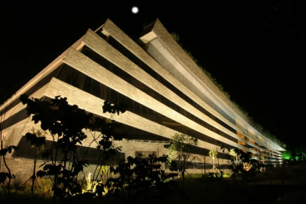 黃龍音樂(lè)廳位于生態(tài)廣場(chǎng)入口處,由黃龍洞投資股份有限公司按國(guó)際標(biāo)準(zhǔn)建設(shè),建筑面積為4970平方米,總投資1.6億元,座位818個(gè)。該音樂(lè)廳背靠植被茂盛的黃龍洞山體,面朝浩瀚的稻田,南鄰潺潺東流的索溪水。整個(gè)建筑為框剪式結(jié)構(gòu),3250平方米斜坡面屋頂全部為綠茵花草屋蓋,是全球最大的綠化屋頂;其外墻由當(dāng)?shù)厍嗍?yè)巖構(gòu)建成的音符弦線(xiàn)幕墻與自然融合一體,形如一本即將展開(kāi)等待世人閱讀的張家界文化寶典,又如鑲嵌在張家界的一塊翡翠,被譽(yù)為“世界環(huán)境最美音樂(lè)廳”。