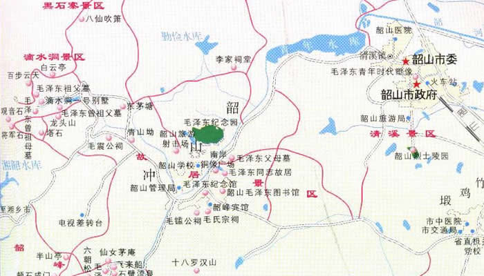韶山市位于湖南省中部偏東的湘中丘陵區(qū),地理坐標為東經(jīng)112°23′52〞-112°38′13〞、北緯27°51′40〞-28°1′53〞。位于湘鄉(xiāng)、寧鄉(xiāng)、湘潭交界處、距湘潭市40公里,距長沙市120公里,人口10萬。相傳舜帝南巡到此,見風(fēng)景優(yōu)美,遂奏韶樂,引鳳來儀,百鳥和鳴,又傳“韶氏三女得道于此,有鳳鳥銜天書到,女皆仙去。”韶山故此得名。現(xiàn)屬湘潭市。湖南省設(shè)韶山管理局。韶山,群山環(huán)抱,峰巒聳峙,氣勢磅礴,翠竹蒼松,田園俊秀,山川相趣。韶峰為南岳七十二峰之一,色彩神奇;青年水庫融藍天,映青山,碧波蕩漾;慈悅庵的六朝松,神秘的“西方山洞”——滴水洞、虎歇坪、滴水洞八景屏等著名景觀,點綴靈秀山川。