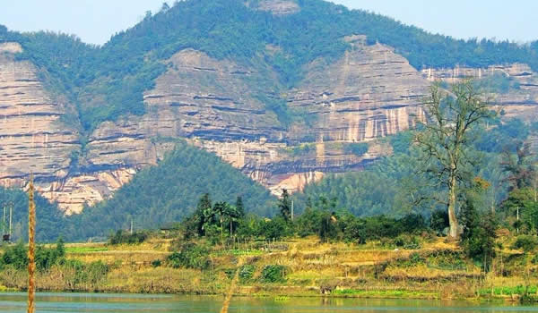 銅梁山位于湘潭縣石鼓鎮(zhèn)境內(nèi),山脈海拔700多米,地勢極為偏僻,正好處于湘潭縣與雙峰縣的交界之處。銅梁山名稱由來還有個美麗的傳說。在雙峰縣井字鎮(zhèn)與湘潭縣、湘鄉(xiāng)市交界處,有一座大山叫昌山。主峰靈應(yīng)峰海拔755.1米,是南岳72峰之一。在主峰與鷹尖石之間,橫臥著一條長達(dá)2公里的一字形平脊嶺,當(dāng)?shù)厝私兴?ldquo;一字大脊”。相傳有一仙人挑著兩個大小不一的籮筐,掌燈時分就來到了大山腳下的花山村。熱情好客的花山人見了這位外來客人,格外歡喜,他們以美酒佳肴相陪,不知不覺已到雞鳴。仙人突然想起師父“雞鳴前一定要翻過大山”的教誨,趲告辭,挑起擔(dān)子飛也似的上山去?墒牵涂偷幕ㄉ饺艘粫䞍罕惆l(fā)現(xiàn),那人的擔(dān)子擱在了山頂,扁擔(dān)成了一條“一字脊”,兩個籮筐便成了一字脊兩端的“巒柱”,形似一個巨大的銅梁。因此,銅梁山這個美名便叫開了。