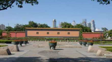 “萬仞宮墻”照壁面臨運瀆,全長近百米。照壁南側(cè)有四個磚刻大字“萬仞宮墻”,每個字約1米見方。仞,是度量單位,我國古代八尺或七尺叫做一仞!叭f仞宮墻”出自《論語·子張篇》:“……夫子之墻高數(shù)(萬)仞,不得其門而入”,意思是贊喻孔子知識淵博,道德文章水平非常之高。