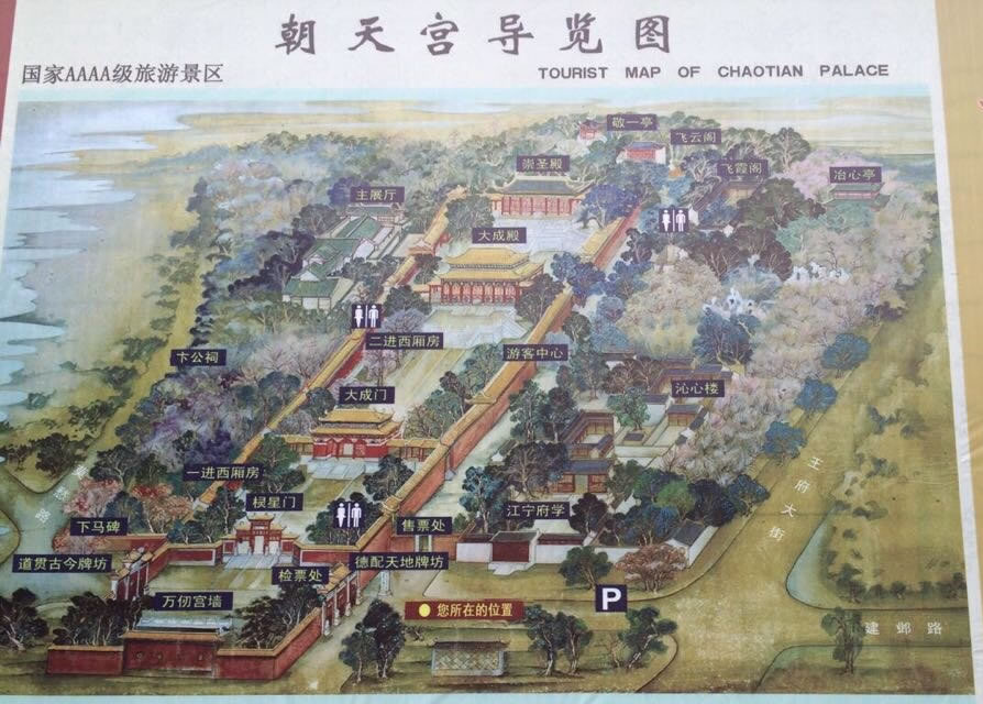 清朝道光年間因朝天宮屢遭火災(zāi),當時風(fēng)水家把朝天宮大山門由朝正東,改為偏向東南。