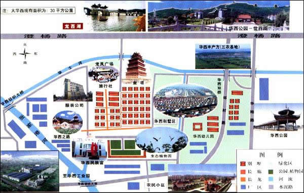 村頭粉墻照壁,后為廣場(chǎng)。廣場(chǎng)上數(shù)十旗桿,飄揚(yáng)著各種圖案的彩旗,這是華西實(shí)業(yè)公司所屬工業(yè)的標(biāo)志,顯示出它的經(jīng)濟(jì)實(shí)力,產(chǎn)值數(shù)十億,產(chǎn)品遠(yuǎn)銷國(guó)外。