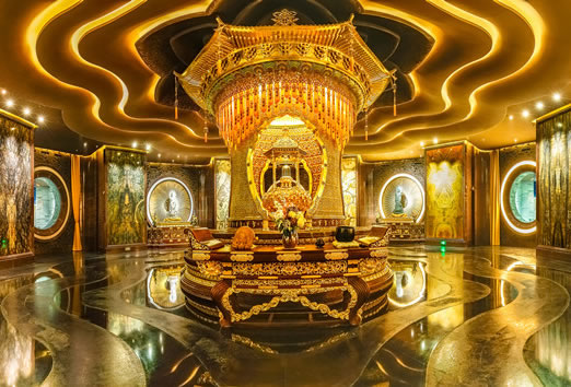 舍利藏宮又稱佛寶層,整體以暗色調(diào)為主,營(yíng)造出莊重的氛圍。由三廳一廊、藏宮大殿(舍利寶幢、拼畫(huà)、四大菩薩)、參拜環(huán)廊三部分組成。這里既是珍藏佛祖頂骨舍利的神圣之地,又是信眾禮佛參拜、靜坐禪修的神秘空間。長(zhǎng)廊長(zhǎng)66米,根據(jù)六波羅密的供養(yǎng)內(nèi)涵,即持戒、布施、忍辱、精進(jìn)、禪定、智慧布局,分別是香供廳、燈供廳、水供廳以及花供長(zhǎng)廊。