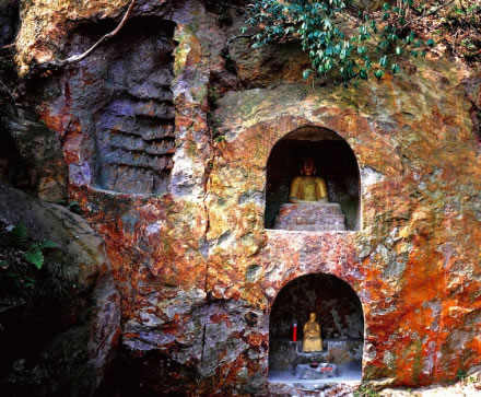 明代摩崖石刻,位于牛首山東峰兜率巖北崖,距離弘覺(jué)寺塔約一百米,旁邊是羅漢泉。石刻整體呈“幾”字形,三面巖石南北長(zhǎng)11.5m,東西寬5.8-8m,中間圍合成約77平方米的平地空間。崖壁上共開(kāi)鑿5個(gè)佛龕,北壁3個(gè),東壁2個(gè),共有133尊雕像。