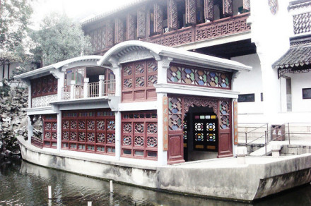石舫,又稱旱船,人稱“不系舟”。位于獅子林水池西北,建于民國初年,系二十世紀(jì)最后一位園主所建。石舫中、后艙均為兩層,四周安有86扇鑲嵌彩色玻璃的和合窗。舫身四面皆在水中,船首有小石板橋與池岸相通,猶如跳板。船身、梁柱、屋頂為石構(gòu),門窗、掛落、裝修為木制。前艙聳起,屋頂呈弧形曲面,中船低平,屋頂為平臺,屋艙上下二屋,有樓梯相通。其制作精巧,造型逼真,細(xì)部花飾已帶有一些西洋風(fēng)味。