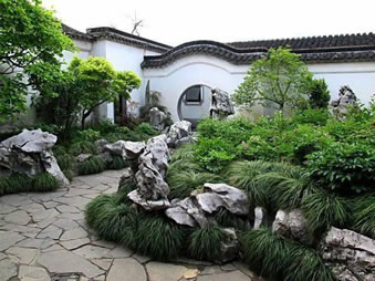 網(wǎng)師園正門前設照墻,大門兩旁置抱鼓石,抱鼓石上飾獅子滾繡球浮雕,額枋上裝有閥閱,大門格局足以顯示園主門第高貴。