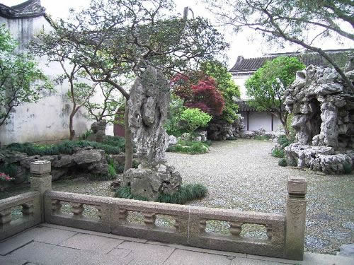 網(wǎng)師園分三部分,境界各異。東部為住宅,中部為主園。網(wǎng)師園按石質(zhì)分區(qū)使用,主園池區(qū)用黃石,其他庭用湖石,不相混雜。突出以水為中心,環(huán)池亭閣也山水錯落映襯。西部為內(nèi)園(風園),占地約1畝。北側(cè)小軒三間,名“殿春簃”。軒北略置湖石,配以梅、竹、芭蕉成竹石小景。軒西側(cè)套室原為著名畫家張大千及其兄弟張善孖的畫室“大風堂”庭院假山,采用周邊假山布局,東墻峰洞假山圍成弧形花臺,松楓參差。南面曲折蜿蜒的花臺,穿插峰石,借白粉墻的襯托而富情趣,與“殿春簃”互成對景。花臺西南為天然泉水“涵碧泉”。北半亭“冷泉亭”因“涵碧泉”而得名。亭中置巨大的靈壁石。