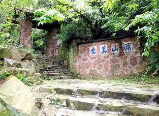 黿頭渚牌樓建于1973年,是前黿頭渚風景區(qū)的老大門,是無錫十八景之首“黿渚春濤”的序幕。“黿”是形似海龜?shù)囊环N動物,“渚”是指三面臨水的小陸地,因為它狀如黿頭而叫黿頭渚。門樓背后刻有“山輝川媚”4個大字,點出了這里“山不高而秀雅,水不深而遼闊”風景的特色。大道前面,有300米的杜鵑坡,杜鵑花是無錫市的市花,清明時節(jié)樹叢、林下、溪邊的杜鵑花開遍山野,映的滿山都是紅色。兩邊是香樟樹,它是無錫的市樹。