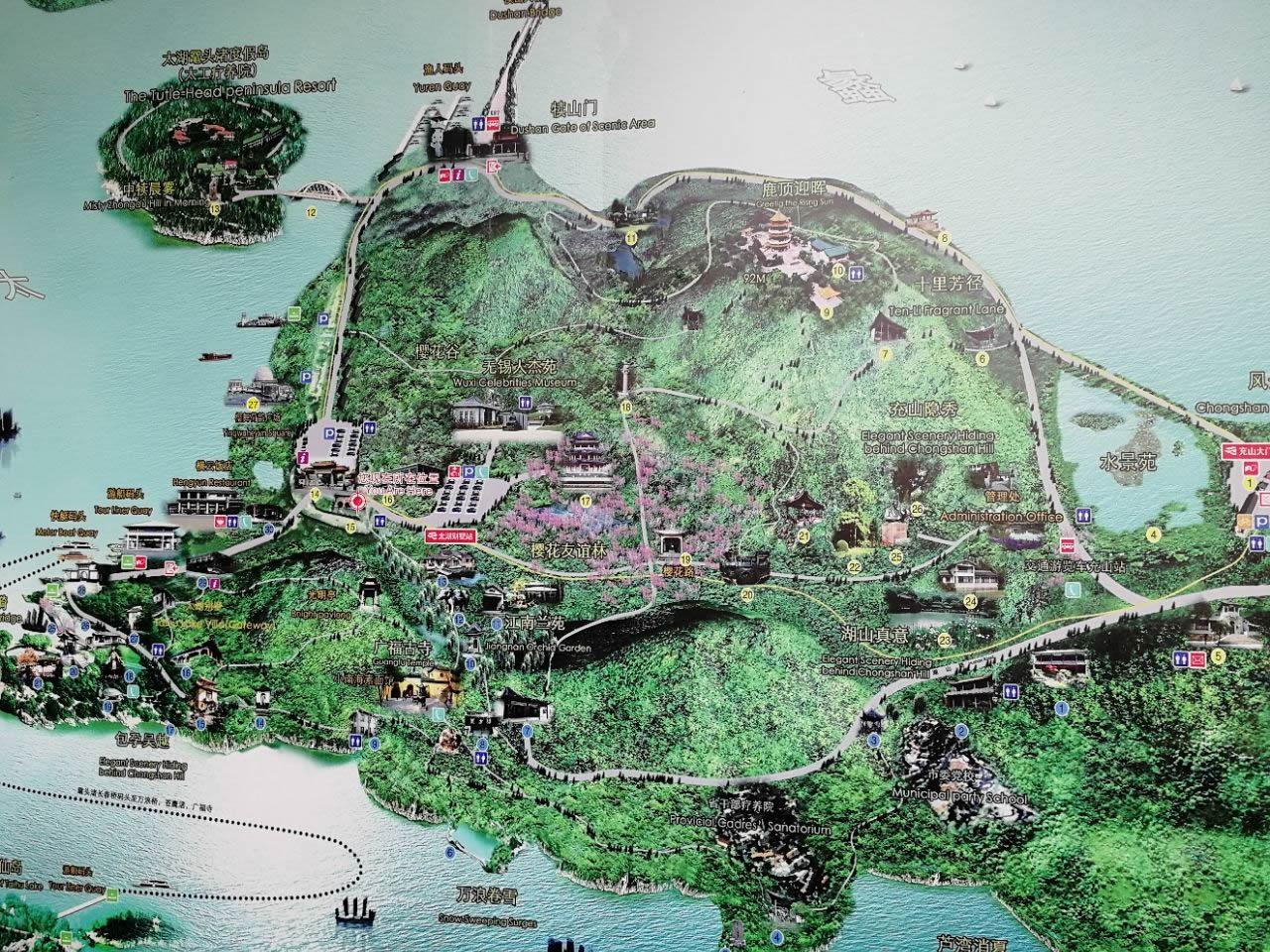 黿頭渚風景區(qū)有充山隱秀、鹿頂迎暉、黿渚春濤、橫云山莊、萬浪卷雪、湖山真意、十里芳徑、太湖仙島、江南蘭苑、櫻花谷、無錫人杰苑及中犢晨霧、廣福古寺等10多處景點。其中有自然山水畫卷;有山鄉(xiāng)田園風光;有江南園林景致;還有吃、住、購、行等配套齊全的服務和娛樂設施,加上歷代名人雅士游蹤、石刻、書畫、傳說等諸多內涵深厚的文化積淀,構成了此地以天然山水為主、人工點綴為輔的綜合性、多功能風景旅游勝地。