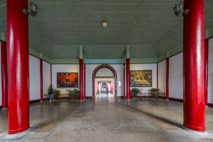 總統(tǒng)府建筑群的主軸線,由門樓、大堂、二堂、八字廳、會客廳、麒麟門、政務(wù)局樓、子超樓組成。建筑風(fēng)格前半部分以中式為主,后半部分則以西式居多。