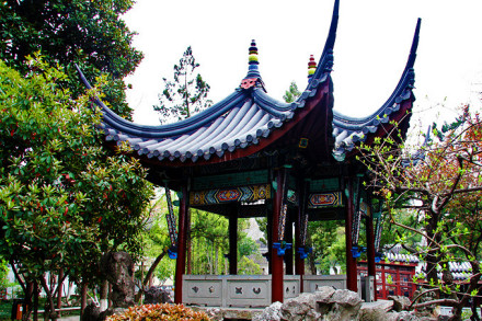 方勝亭,俗稱"鴛鴦亭",是民國前江南惟一的方勝亭。方勝,又稱雙菱,指兩菱形相疊。亭基方勝,上為雙頂、遠(yuǎn)觀似雙亭并立,近看卻一亭獨(dú)佇,小巧玲瓏,頗為別致。飛檐翹角,如欲飛的鴛鴦。梁柱間有很大的彩繪"雀替木",這是清代建筑的特征之一。因其少用斗拱,為出挑檐,只得加大這種斜角支撐物。亭里可見一些龍鳳獅虎等動物形狀的刻繪。