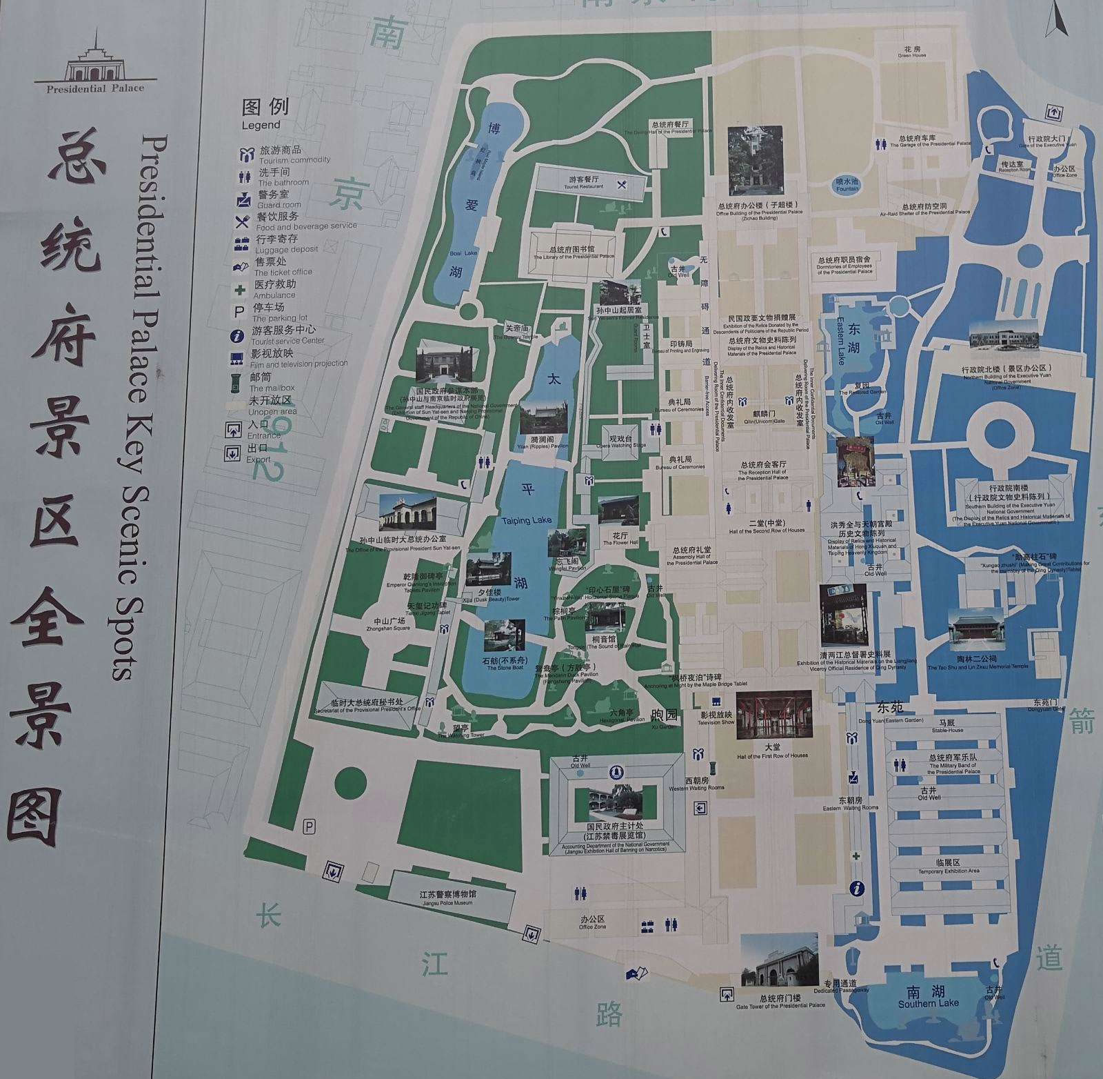 總統(tǒng)府(中國近代史博物館)占地面積9萬平方米,共分三個參觀區(qū)域。中區(qū)(中軸線)主要是國民政府、總統(tǒng)府及所屬機(jī)構(gòu);西區(qū)是孫中山的臨時大總統(tǒng)辦公室、秘書處和西花園,以及參謀本部等;東區(qū)主要是行政院舊址、馬廄和東花園。一系列展館和史料陳列,則分布在這三個區(qū)域中。
