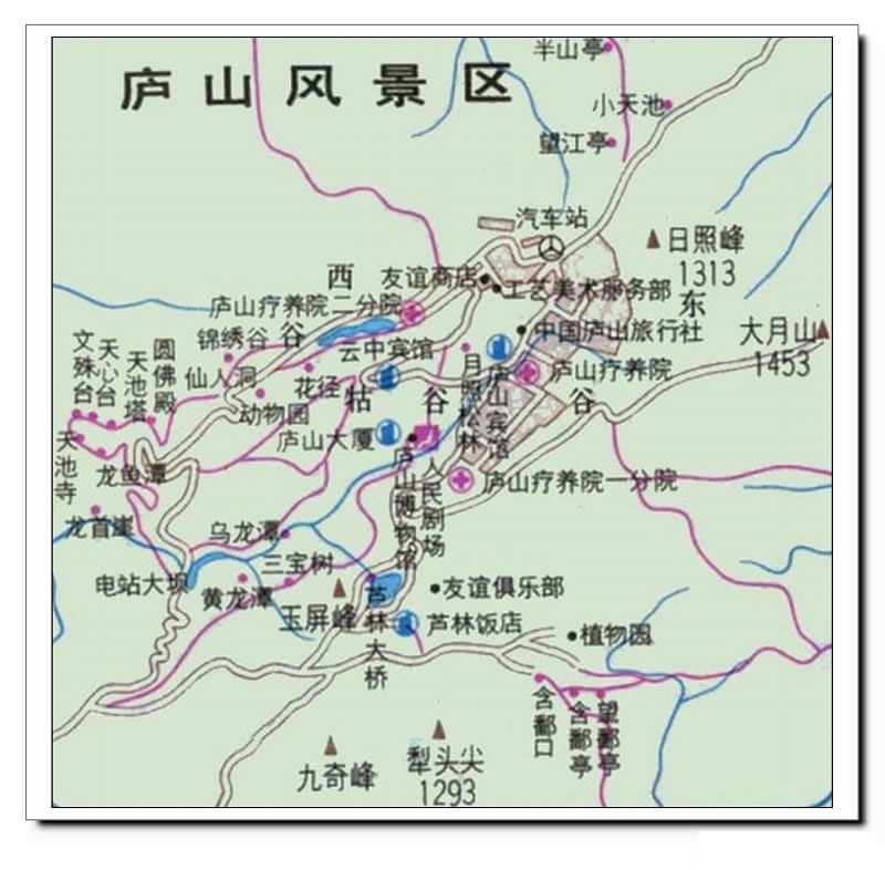 1 :北山公路-北山園門-小天池-望江亭-花徑-如琴湖-天橋-錦繡谷-仙人洞-大天池-蘆林湖-會(huì)址-東谷名人別墅-美廬-周恩來紀(jì)念室-牯嶺街