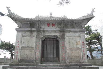 御碑亭位于廬山仙人洞一側(cè)的白鹿升仙臺(tái)上,是明朝皇帝朱元璋所建造的。明朝洪武二十六年九月(1393年)朱元璋為了紀(jì)念周顛仙等人就在這臺(tái)上建起了御碑亭。亭中至今還保存著朱元璋的御碑。碑上刻著這位朱皇帝親自撰寫的《周顛仙人傳》和《四仙詩》。這塊御碑高約4米、寬1.3米、厚0.23米。