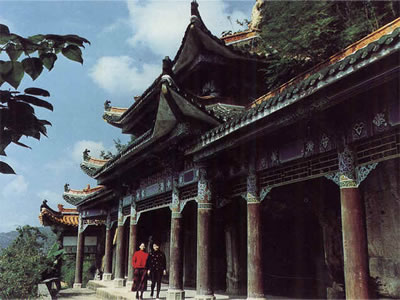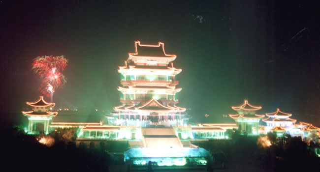 由一級(jí)高臺(tái)拾級(jí)而上,即達(dá)二級(jí)高臺(tái)(象征城墻的臺(tái)座)。這兩級(jí)高臺(tái)共有89級(jí)臺(tái)階,而新閣恰于1989年落成開放。二級(jí)高臺(tái)的墻體及地坪,均為江西峽江縣所產(chǎn)花崗石。高臺(tái)的四周,為按宋代式樣打鑿而成的花崗石欄桿,古樸厚重,與瑰麗的主閣形成鮮明的對(duì)比。