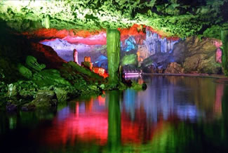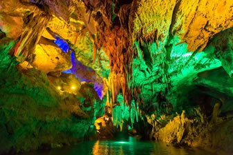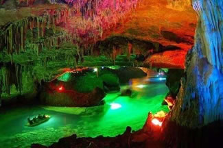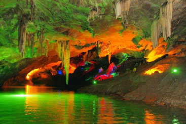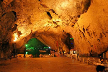 通往水洞的碼頭,千余平方米的水面,宛如一幽靜別致的“港灣”,燈光所及,水中游船、洞中石景倒映其中,使人如入仙境。從護岸石階拾級而下,通過長廊從碼頭上船,即可暢游水洞。水洞全長5800米,現(xiàn)已開發(fā)2800米,面積3.6萬平方米,空間40余萬立方米,最開闊處高38米,寬70米。