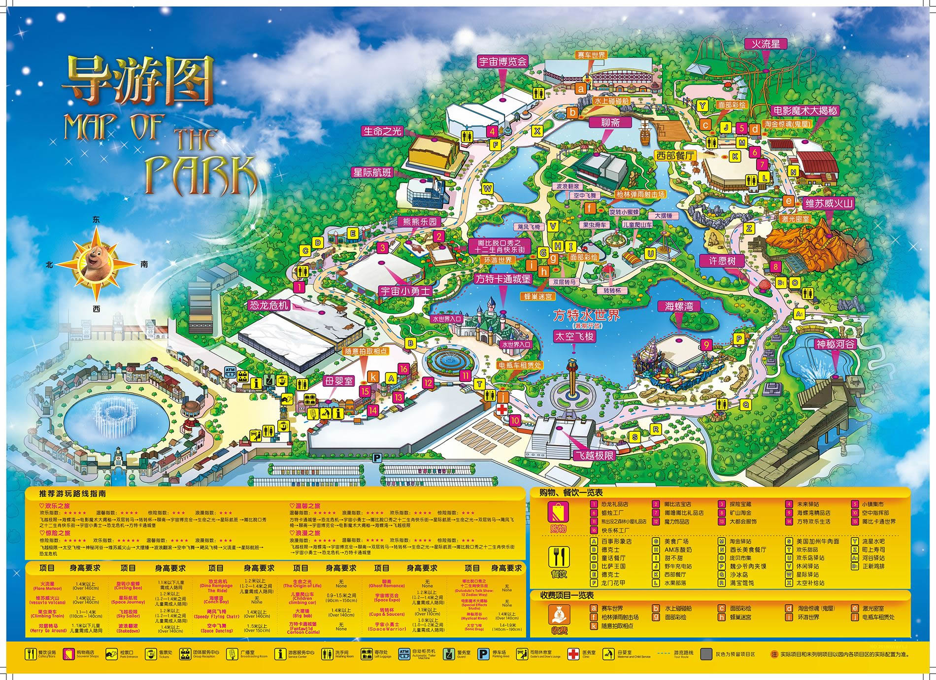 飛越極限→太空飛梭→神秘河谷→維蘇威火山→大擺錘→火流星→颶風(fēng)飛椅→空中飛舞→瘋狂成語→恐龍危機(jī)