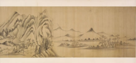 董其昌仿米黃山水圖卷:明晚期,絹本。用筆參以披麻與米點(diǎn)皴法,為其自家面貌。卷后部行書自題:“家有黃子久《富春大嶺圖》、米元暉《瀟湘圖》,和會(huì)兩家筆意為此卷,大都子久畫出于巨然與海岳父子同參也!焙笫鹂睿骸岸鬃R(shí)”,下鈐“知制誥日講官”、“董其昌印”白文印二方。款側(cè)鈐“楨父審定”、“墨緣堂來氏收藏書畫記”二印。