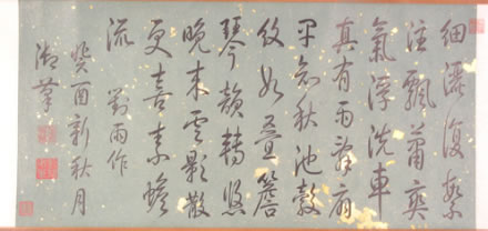 清弘歷行書對(duì)雨詩卷:此書卷作于乾隆十八年(1753)。綠色片金蠟箋紙。引首騎縫鈐篆書朱文“石渠寶笈所藏”方印,行書寫自作五言律詩一首,全詩為“細(xì)灑復(fù)絮注,飄蒲爽氣浮。洗車真有雨,壽扇果知秋。池轂紋如疊,檐琴韻轉(zhuǎn)悠。晚來云影散,更喜素蟾流!痹姾笞灶}“對(duì)雨作”,后署款“癸酉新秋月,御筆”。