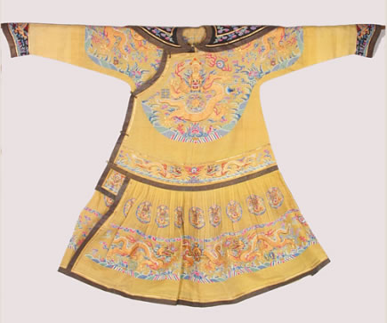 清明黃納紗五彩金龍夏朝服:清代光緒皇帝載湉御用。此朝服是夏季禮服之一,為其登基、大婚、萬壽圣節(jié)、祭天等重大典禮和祭祀活動(dòng)時(shí)所穿禮服。為明黃顏色,是一種披肩領(lǐng)、馬蹄袖的大襟袍。披肩為黑紗地納紗繡平金龍二條,上衣兩肩和前胸、后背飾正龍各一條,飾有傳統(tǒng)紋樣十二章,間以五色云紋,下幅為平水紋飾。