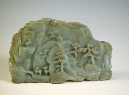 清青玉巧琢樓閣松鶴山子:青玉質(zhì)地,外帶棕黃色皮殼,總體呈立體山形。一面以凸雕、透雕等技法琢成山峰、瀑布、小橋、松樹,樹后掩映一座古寺,檐脊重重,清幽雅致,寺前一老者攜抱琴童子徐徐而行;另一面以凸雕、透雕等技法琢成山石、瀑布、樓閣、松樹等圖案,山下兩鹿一前一后,如影隨行;山上雙鶴相望呼應(yīng),寓有“鶴鹿同春 部山石上另刻有御題《朱砂峰》五言詩一首。山子下附有透雕木座。