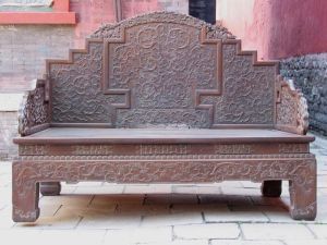 崇政殿室內(nèi)的寶座、屏風(fēng)等陳設(shè),并非清太宗時(shí)期的原貌,而是乾隆十二年(1747年)根據(jù)皇帝的旨意重新設(shè)計(jì)制做的,堂陛之內(nèi)的屏風(fēng)寶座,是乾隆特命仿北京故宮乾清宮所用加以縮小精心制作的,寶座、屏風(fēng)各以九條龍做為主要裝飾,全部罩以金漆,體現(xiàn)其唯一的使用者──皇帝的無上尊嚴(yán)。屏風(fēng)上的四言十二句銘文,與乾清宮屏風(fēng)上的完全相同 ,是康熙皇帝從古代經(jīng)書中摘出,做為自己和后世皇帝治理國家的座右銘鐫刻在御座之旁的。陳設(shè)在龍椅前后的鶴式燭臺(tái)、熏爐、塔式香亭、 端、“太平有象”等,都是乾隆年間宮中精制的琺瑯禮器,專用于皇帝御座周圍,既為熏香之用,也有驅(qū)邪諏吉的寓意,使得“真龍?zhí)熳印迸R朝理政之處更具有莊嚴(yán)神圣的氣氛。乾隆、嘉慶、道光幾位皇帝東巡盛京期間,都曾坐在這里接受群臣的朝賀叩拜,慶祝自己祭陵大典的成功。