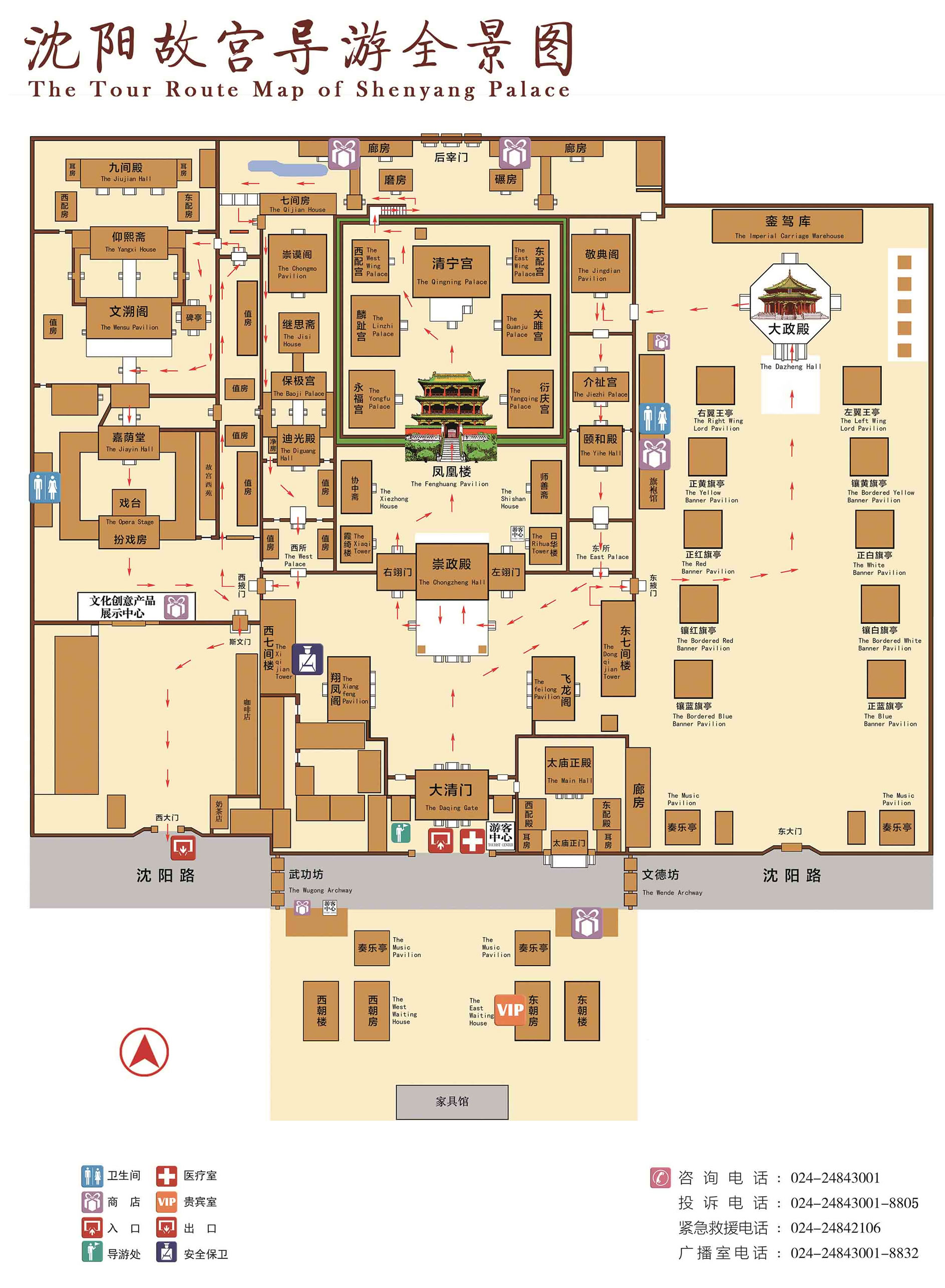 中路為整個(gè)建筑群的中心,分前后3個(gè)院落。南端為照壁、東西朝房、奏樂亭;前院有大清門、崇政殿、飛龍閣、翔鳳閣;中院有師善齋、協(xié)中齋、鳳凰樓;后院是以清寧宮為主的五宮建筑。中院和后院兩側(cè)各有一跨院,稱東宮、西宮。東宮有頤和殿、介祉宮、敬典閣;西宮有迪光殿、保極宮、繼思齋、崇謨閣。大清門是沈陽故宮的正門,是文武群臣候朝之處,為五間硬山式建筑,正脊、垂脊及兩山的“墀頭”均以五彩琉璃鑲造。崇政殿是故宮的正殿,建于后金天聰時(shí),是清初朝會(huì)之所,為五間九檁硬山式,俱辟隔扇門,前后有出廊,圍以石雕欄桿。頂蓋黃琉璃瓦鑲綠剪邊,殿內(nèi)徹上明造,梁架全部為和璽彩繪。殿前東置日晷,西設(shè)嘉量。殿后是鳳凰樓,同清寧宮、關(guān)睢宮、衍慶宮、永福宮、麟趾宮五宮建在近4米的高臺(tái)之上,四周繞以高墻,獨(dú)成一座宮院。