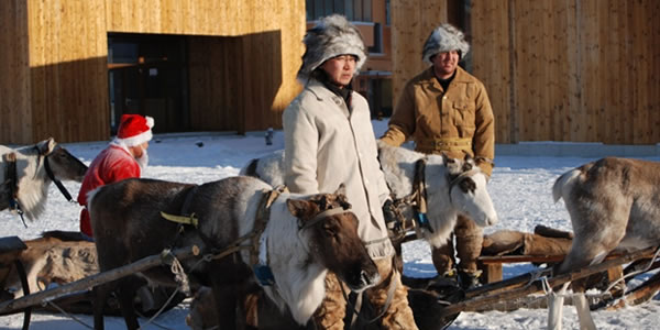 敖 生態(tài)環(huán)境 這里是森林與草原的界線,大興安嶺和呼倫貝爾大草原在這里交匯,一邊是草原、河流,一邊是森林、山崗,空氣新鮮,野味十足,當(dāng)?shù)厝税氘?dāng)真的說(shuō)"這地方絕對(duì)沒(méi)有污染,連蒼蠅、蚊子都是綠食食品"。 國(guó)家給敖魯古雅鄉(xiāng)人建立了定居地,但馴鹿只能生活在森林里,所以除了在定居點(diǎn)的部分村民,密林中還散布著五個(gè)馴鹿站,最遠(yuǎn)的在150公里。過(guò)去,敖魯古雅人養(yǎng)馴鹿只是作為運(yùn)輸工具,一頭馴鹿可以負(fù)重35公斤左右,每小時(shí)可以行走5公里,1964年,取得了割鹿茸成功,F(xiàn)在,馴鹿已經(jīng)不大用來(lái)運(yùn)輸了,而成了當(dāng)?shù)厝说闹饕?jīng)濟(jì)來(lái)源,中國(guó)唯一的這群馴鹿大約只有10000只左右了。 敖鄉(xiāng)民俗村 敖魯古雅鄂溫克民俗村位于根河市西郊,南臨S301國(guó)道,交通十分便利。民俗村總建筑面積58,700平方米,是集大中型會(huì)議、休閑度假、民俗展示、娛樂(lè)為一體的綜合性旅游度假村,是一處自然——人文旅游 景觀。 民俗村依托森林、河流,鄂溫克獵民的民俗民風(fēng),推出一系列具有地方特色的旅游活動(dòng)項(xiàng)目:主要有森林觀光、探險(xiǎn)、模擬狩獵;觀民族宗教、歌舞、民俗表演;品嘗民族風(fēng)味餐、參觀敖鄉(xiāng)新居、訪獵民等活動(dòng);村內(nèi)建有木質(zhì)別墅式的游客服務(wù)中心,民俗文化博物館、民俗表演平臺(tái)、表演廳和餐廳、反映鄂溫克獵民歷史的圖騰廣場(chǎng)、有四十、五十、六十年代不同的撮羅子,有上山索道車(chē)、木橋和四處風(fēng)格獨(dú)特的獵民點(diǎn);還有民俗表演隊(duì)和馴鹿車(chē)穿行其中,可對(duì)敖魯古雅鄂溫克獵民的歷史、文化、宗教、習(xí)俗進(jìn)行了充分的展示。 敖魯古雅鄉(xiāng)距離我國(guó)最北端的漠河縣約一百公里左右的路程,位于大興安嶺深處的滿歸林區(qū)。這里氣候十分寒冷,記者走在蜿蜒的山路上,腳下的積雪發(fā)出“咯吱咯吱”的脆響,眼前已是呵氣成冰,身上的棉襖凍得硬梆梆的。隨行的鄉(xiāng)黨委書(shū)記鮑玉林說(shuō):“現(xiàn)在大約是零下30攝氏度,你們趕上好時(shí)候了,往年這個(gè)時(shí)候得有零下五十度,外面到處冒白煙。” 敖魯古雅鄉(xiāng)有一條主干道,長(zhǎng)不過(guò)二三百米。道兩邊是整齊的幾排木刻楞房和磚瓦房,象征著主人的富裕程度。敖鄉(xiāng)雖小,卻擁有自己的博物館、學(xué)校、文化站和小商店。春節(jié)雖過(guò),但喜慶氣氛尚濃,白雪映襯下,墻上的大紅對(duì)聯(lián)分外惹眼。 敖鄉(xiāng)生活著近500人,其中鄂溫克人大約有230人。他們現(xiàn)在已經(jīng)是獵民定居后的第三代了。在離此50到100多公里的山林中,還有四個(gè)獵民點(diǎn),生活著30多名習(xí)慣于打獵和在山上飼養(yǎng)馴鹿的老獵民們。