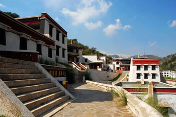 現(xiàn)存六大經(jīng)堂為蘇古沁殿、洞科爾殿、卻伊日殿(顯教經(jīng)堂)、當(dāng)圪希德殿、阿會殿(密宗經(jīng)堂)、日木倫殿(菩提道學(xué)經(jīng)堂)等。蘇古沁殿為全寺集會誦經(jīng)之所。這些殿宇規(guī)模宏大,均為典型的藏式建筑群。殿內(nèi)塑像、壁畫、唐卡(卷軸佛畫)俱全,各殿各有特色,或立高達(dá)十米的釋迦牟尼銅像,或供高達(dá)九米的黃教始祖宗喀巴銅像,或護(hù)法金剛像,或供奉白度母和綠度母塑像等。三座活佛府邸在阿會殿的南面,其中洞科爾活佛府規(guī)模宏大,為第二世活佛熱西尼瑪于乾隆四十九年(公元1784年)所建。左右是接待多倫諾爾匯宗寺甘珠爾瓦呼圖克圖和章嘉國師而建造的兩座府邸。
