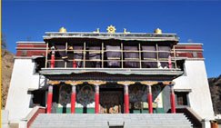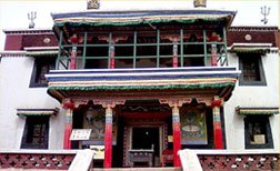 喇彌仁殿(菩提道學(xué)經(jīng)堂),又稱日木倫殿。建于光緒十八年(1892年),位于護(hù)法殿后邊西北高聳的山坡上,為教義戒律學(xué)部,這個學(xué)部在內(nèi)蒙地區(qū)藏傳佛教寺院中只有五當(dāng)召設(shè)立。是召廟建筑群中建造年代最晚的建筑物。殿內(nèi)正中供奉銅鑄高九米的黃教創(chuàng)始人宗喀巴坐像。左右兩側(cè)塑其兩大弟子嘉曹杰和克珠杰塑像。兩側(cè)木龕內(nèi)有一千尊一模而成的宗喀巴塑像。二樓凸起的天窗既可容納高大的塑像,又可采納光線,顯示了獨(dú)具匠心的藏傳佛教寺廟建筑特點(diǎn)。