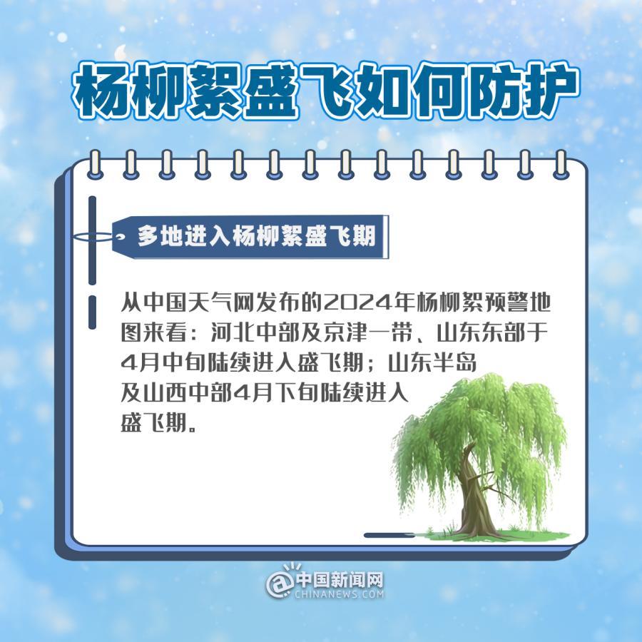 從中國天氣網發(fā)布的2024年楊柳絮預警地圖來看:河北中部及京津一帶、山東東部于4月中旬陸續(xù)進入盛飛期;山東半島及山西中部4月下旬陸續(xù)進入盛飛期。楊柳絮都有哪些危害?公眾日常如何做好防護?