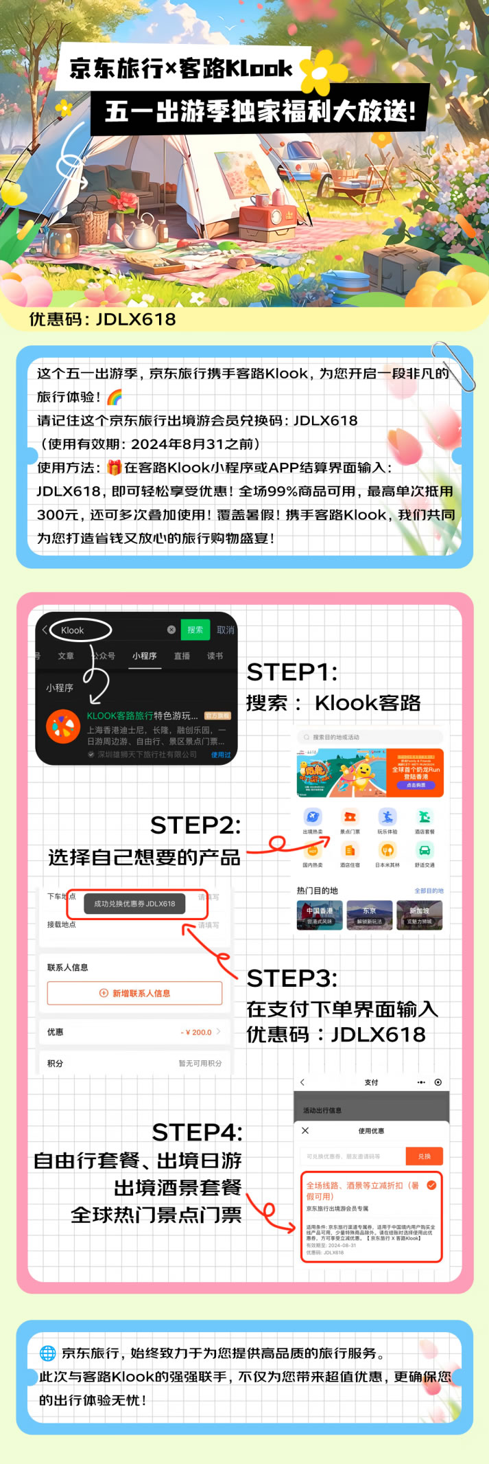 目前,中國已和23個(gè)國家實(shí)現(xiàn)全面互免簽證。相關(guān)平臺數(shù)據(jù)顯示,今年“五一”出境游熱度飆升,新近免簽的新馬泰更是熱門之選。泰國曼谷芭提雅6日游,帶你去曼谷逛大皇宮、芭提雅看人妖表演、沙美島出海,還提供五星酒店住宿、泰式美食盛宴等,僅5199元起。想自由行,推薦4759元起的馬來西亞吉隆坡6天5晚游,包含北京直飛往返機(jī)票以及1晚網(wǎng)紅酒店住宿。值得關(guān)注的是,京東旅行還攜手專注于境外目的地的旅游體驗(yàn)預(yù)定平臺客路Klook送上獨(dú)家福利。消費(fèi)者在Klook小程序或者APP下單任何產(chǎn)品,輸入優(yōu)惠碼JDLX618,單次下單享至高300元優(yōu)惠,覆蓋全場99% 商品,且可多次疊加使用。