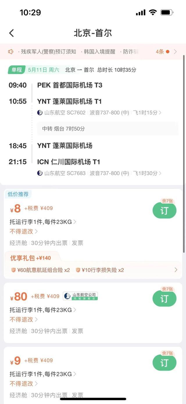 國(guó)際機(jī)票方面,中新經(jīng)緯查詢(xún)發(fā)現(xiàn),5月11日北京飛往首爾的機(jī)票(不含稅)價(jià)格低至8元,但另需409元稅費(fèi)。具體來(lái)看,該航班5月11日早9點(diǎn)40分從北京首都機(jī)場(chǎng)起飛,經(jīng)煙臺(tái)蓬萊國(guó)際機(jī)場(chǎng)轉(zhuǎn)機(jī),于當(dāng)天晚上9點(diǎn)15分落地仁川國(guó)際機(jī)場(chǎng)。