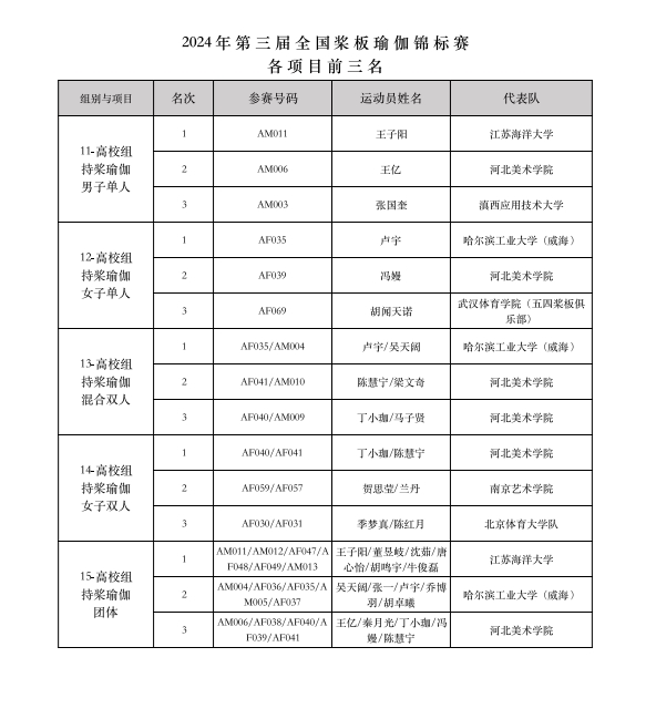 最終經過為期兩天的激烈競賽,“意爾康杯”2024年第三屆全國槳板瑜伽錦標賽共決出槳板瑜伽、持槳瑜伽、槳板體適能等3大類共22項比賽各項前三名的獲獎名次。