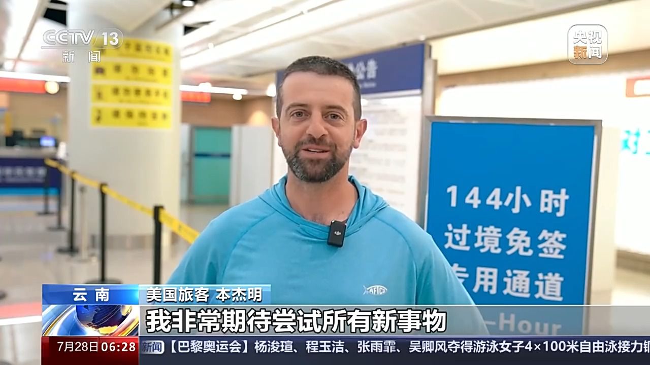 7月16日,在昆明國(guó)際機(jī)場(chǎng),美國(guó)旅客本杰明,成為云南省144小時(shí)過境免簽政策停留范圍擴(kuò)大后首位享受政策便利的旅客。
