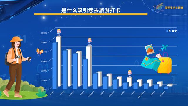 《美好生活大調(diào)查》發(fā)現(xiàn),自然景觀是吸引大家去旅游打卡的最主要因素,有將近一半的人會(huì)因此選擇旅游目的地。名勝古跡、歷史民俗文化和特色美食緊隨其后。不同人群中,女性對(duì)城市的特色美食超級(jí)偏愛(ài),因?yàn)樘厣朗橙ヒ粋(gè)城市旅游的女性占比高出男性11個(gè)百分點(diǎn)以上。跟女性相比,男性對(duì)名勝古跡和特色民宿/酒店更感興趣一點(diǎn)。