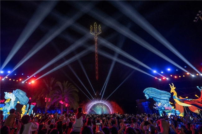 活動(dòng)期間,每晚都會(huì)上演《深?駳g》無(wú)人機(jī)水幕秀。視頻內(nèi)容通過(guò)人工智能建模技術(shù),實(shí)現(xiàn)了角色形象的高精度三維重建,構(gòu)建出具有高度真實(shí)感和動(dòng)態(tài)表現(xiàn)力的虛擬角色。隨著劇情的推進(jìn),數(shù)百架無(wú)人機(jī)在夜空中變幻多種圖案,點(diǎn)亮海棠夜空,演繹出獨(dú)屬于亞特蘭蒂斯的海底狂歡。