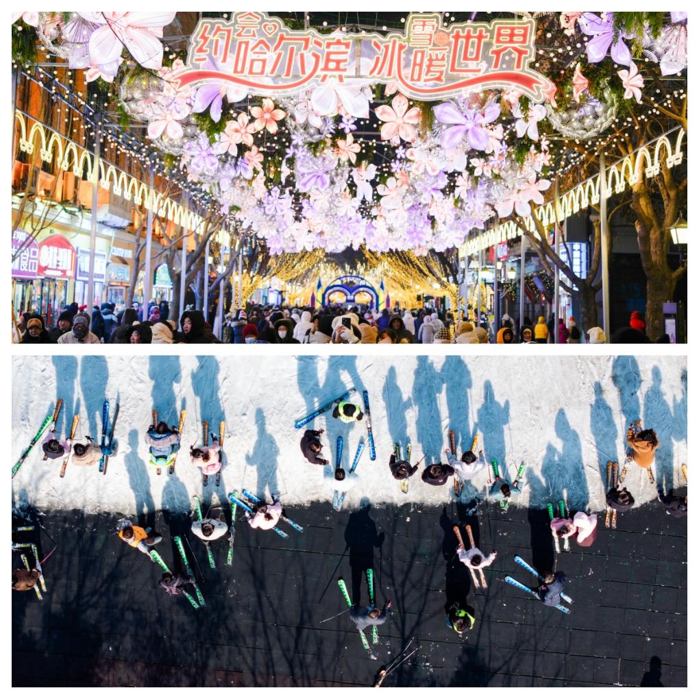 拼圖:(上圖)1月30日,游客在哈爾濱中央大街上游玩、拍照。(下圖)2月3日,游客在江蘇省淮安市馬頭鎮(zhèn)的古運(yùn)河滑雪場(chǎng)滑雪(無人機(jī)照片)。