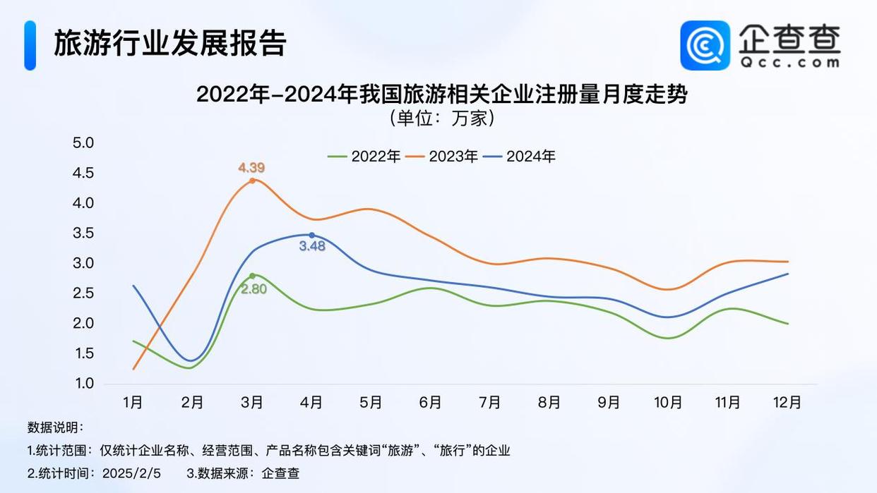 企查查數(shù)據(jù)顯示,2024年,我國(guó)累計(jì)注冊(cè)31.3萬(wàn)家旅游相關(guān)企業(yè),分月份來(lái)看,4月相關(guān)企業(yè)注冊(cè)量達(dá)3.48萬(wàn)家,是全年注冊(cè)量最高月份;從2022年至2024年我國(guó)旅游相關(guān)企業(yè)注冊(cè)量月度分布來(lái)看,每年的3月、4月是旅游相關(guān)企業(yè)注冊(cè)高峰期。