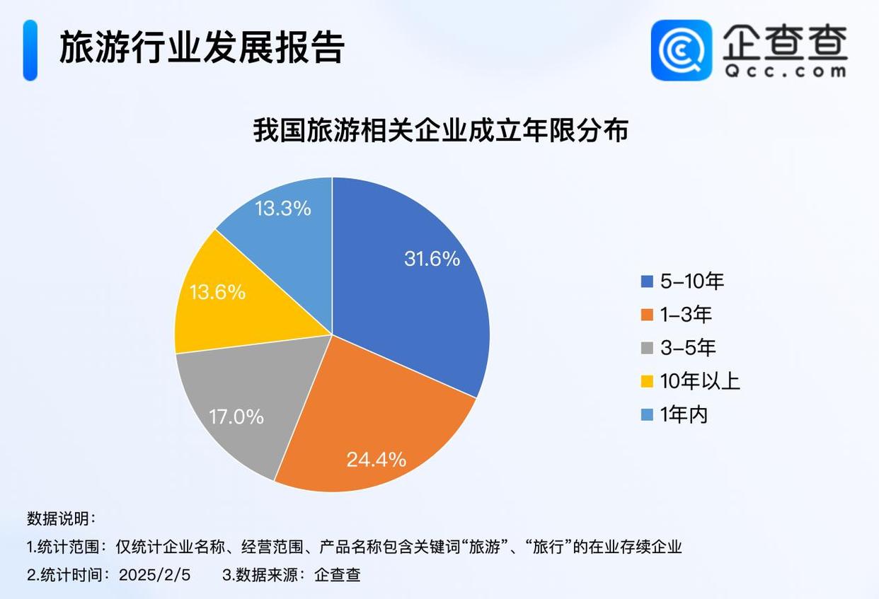 企查查數(shù)據(jù)顯示,我國(guó)現(xiàn)存220.4萬(wàn)家旅游相關(guān)企業(yè)。成立年限上,我國(guó)成立5-10年的旅游相關(guān)企業(yè)最多,占比31.6%,其次是成立1-3年的企業(yè),占比24.4%,成立1年內(nèi)的企業(yè)數(shù)量最少,占比13.3%。