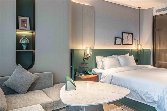 酒店由法國(guó)設(shè)計(jì)師Jave操刀設(shè)計(jì),以"楚韻新譯"為理念,巧妙融合現(xiàn)代奢華元素與荊楚文化傳統(tǒng)特色,打造出既具時(shí)代風(fēng)尚又飽含文化底蘊(yùn)的獨(dú)特空間。大堂主體采用大面積玻璃幕墻,搭配莫蘭迪紅綠配色點(diǎn)綴,白天,陽(yáng)光透過(guò)玻璃傾灑,大堂內(nèi)溫馨明亮,宛如璀璨水晶宮殿;夜晚,借助精妙燈光設(shè)計(jì),呈現(xiàn)出迷人光影效果,成為城市夜色中耀眼的明珠。