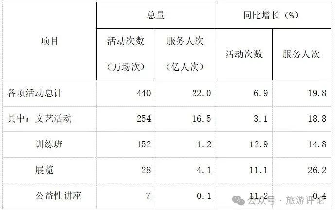 全年全國群眾文化機構共組織開展各類文化活動440萬場,同比增長6.9%;服務22億人次,同比增長19.8%!