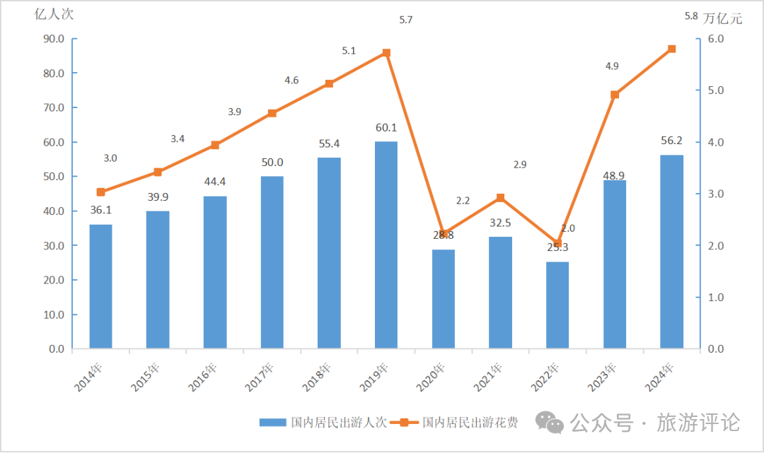 2024年,國內居民出游56.2億人次,同比增長14.8%。其中,城鎮(zhèn)居民國內出游43.7億人次,同比增長16.3%;農村居民國內出游12.5億人次,同比增長9.9%。國內居民出游總花費5.8萬億元,同比增長17.1%。其中,城鎮(zhèn)居民出游花費4.9萬億元,同比增長18.0%;農村居民出游花費0.8萬億元,同比增長12.2%!