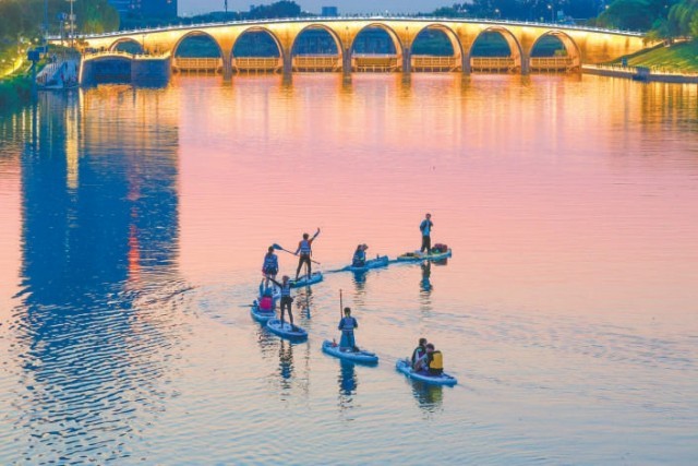 水聲、指導(dǎo)聲,夾雜著成功駕馭后的歡呼聲,交織成大運河上獨特的活力樂章。微風拂過,帶來水汽的清涼,也吹散了一些夏日燥熱。阿珂說,俱樂部正在推廣“城市微度假、微旅行”的理念,給年輕人打造一個不用出遠門就有休閑度假感的娛樂解壓場景。“大運河比城里的護城河、亮馬河寬闊得多,傍晚時分波光粼粼的感覺棒極了!濱水休閑步道以及各類配套服務(wù)設(shè)施也挺完善,真的很適合微度假。”他說,接下來希望能帶更多人在大運河上體驗槳板運動的快樂。